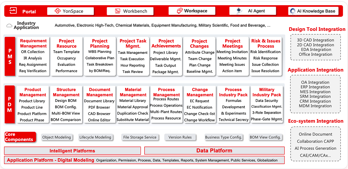 YonBIP PLM is a product lifecycle management software platform, which fully covers the needs of product innovation. PLM involves multiple sub-fields including product modeling, product data management, and R&D process management. It provides capabilities such as product requirement analysis, product data and change management, collaborative project management, design tool integration, and manufacturing integrated collaboration, thereby realizing the standardization and collaboration of R&D processes in product innovation, improving R&D efficiency and product data quality, reducing changes, and thus lowering the overall cost of enterprises and enhancing core competitiveness.